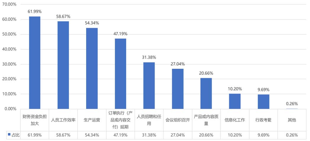 ? ? ??61.99%文化企業表明面臨最大的挑戰是資金的壓力;58.67%文化企業工作效率收到嚴重影響;54.35%文化企業生產運營受到影響;47.19%文化企業導致訂單執行延期。信息化工作及行政考勤的壓力相對較小,分別僅占10.20%和9.69%。在信息化發達的今天,雖然受疫情影響,大多數文化企業已經完全可以解決線上辦公和行政考勤,難題是外部收入減少帶來的現金流壓力,以及如何保證線上辦公時工作效率和正常生產運營。