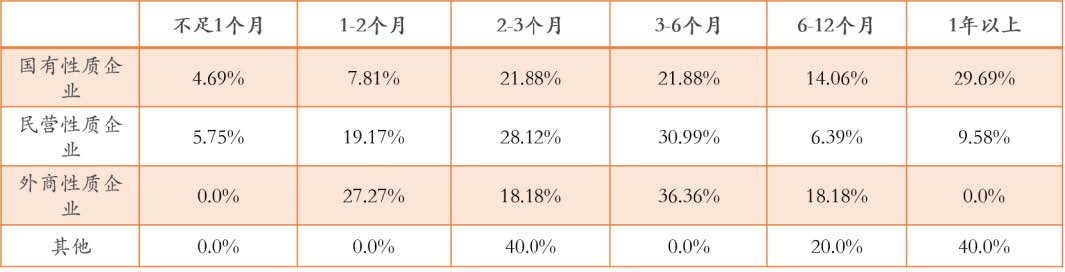 ? ? ??文化企業賬上資金支撐,不足一個月的占5.35%,1-2個月的占17.35%,2-3個月的占26.79%,3-6個月的占29.34%,6-12個月的占到8.16%,1年以上的占到13.01%。文化企業相比于其他行業(如餐飲業、商業等),具備一定的抗風險能力。
